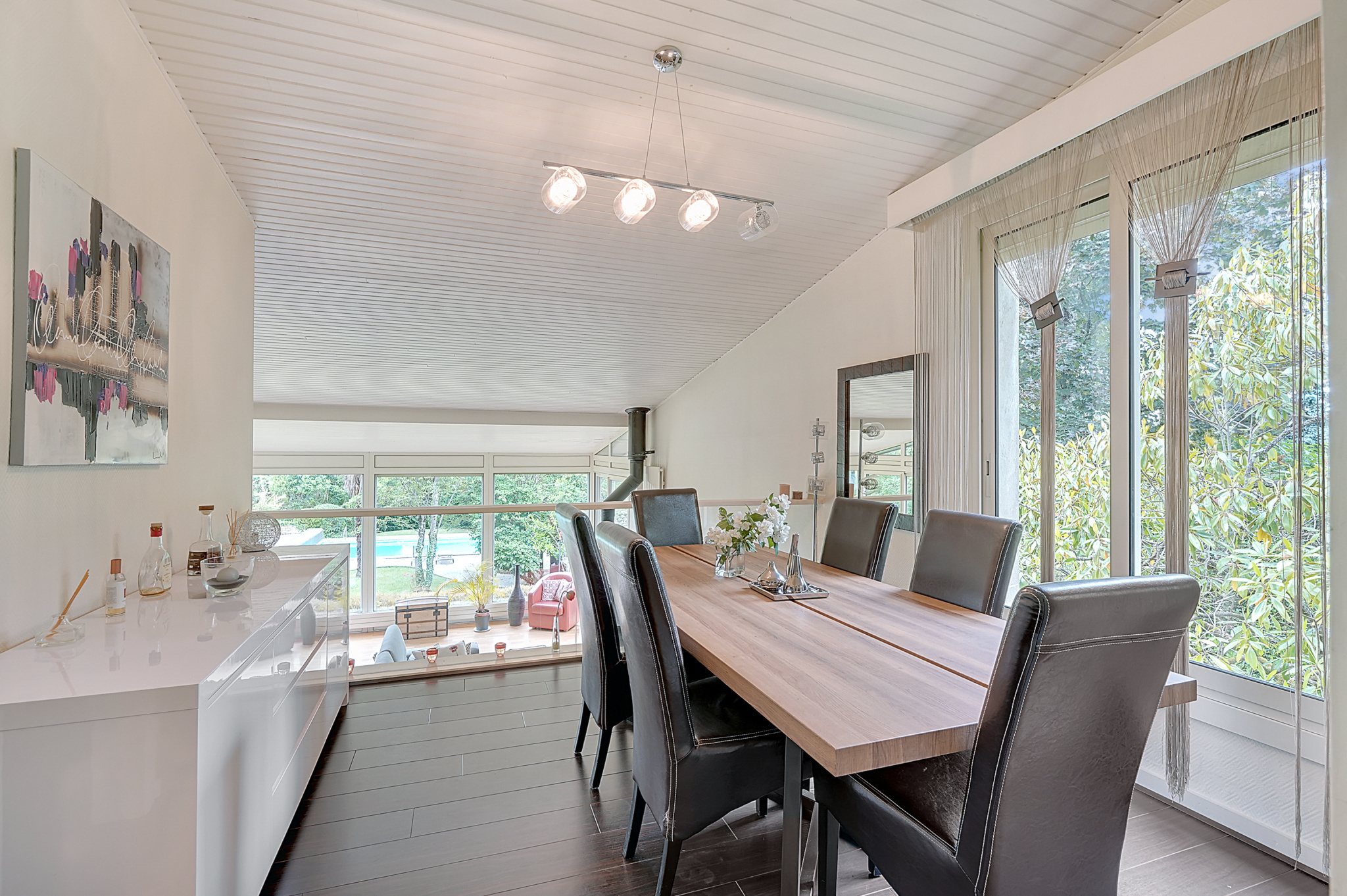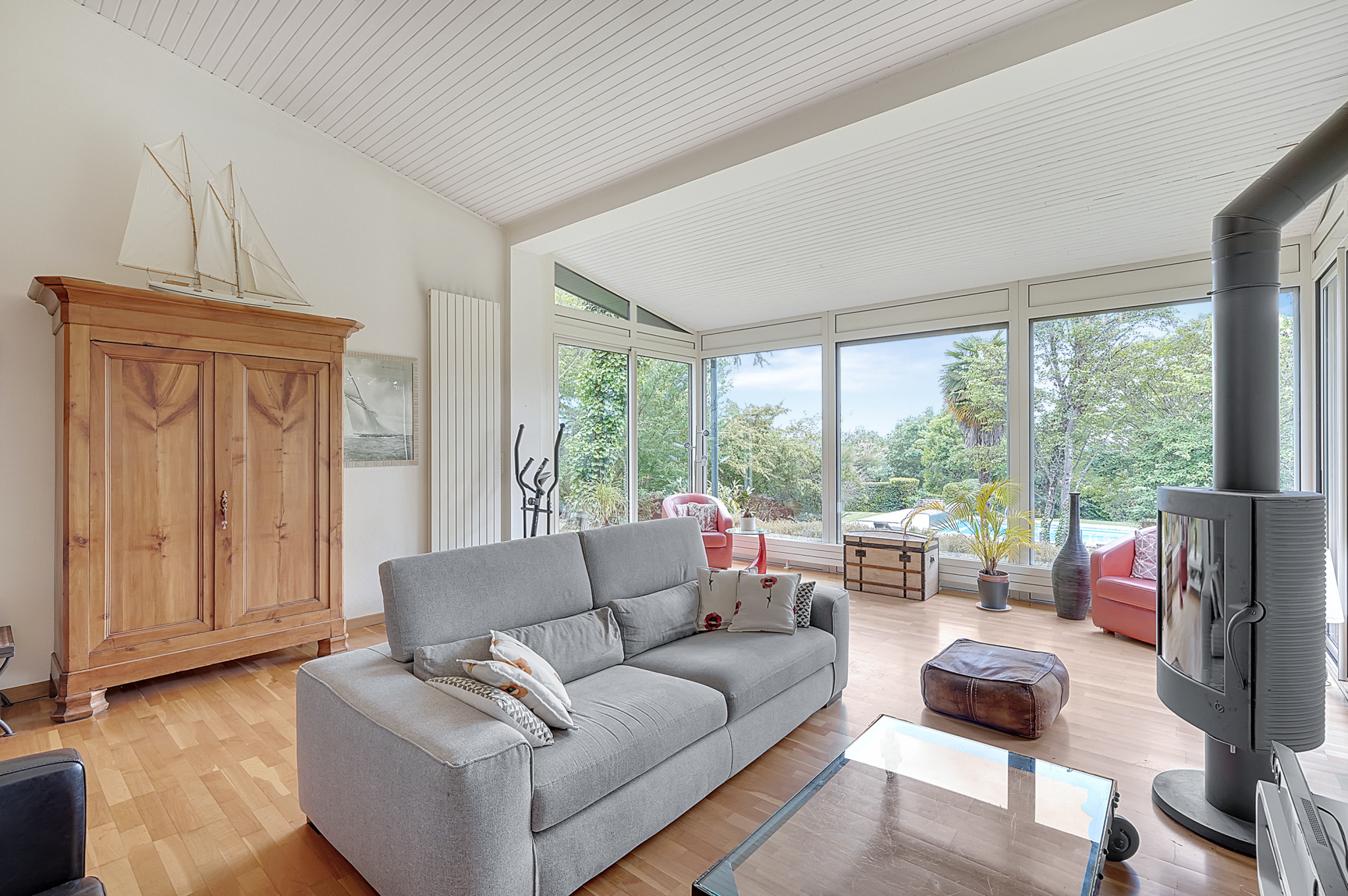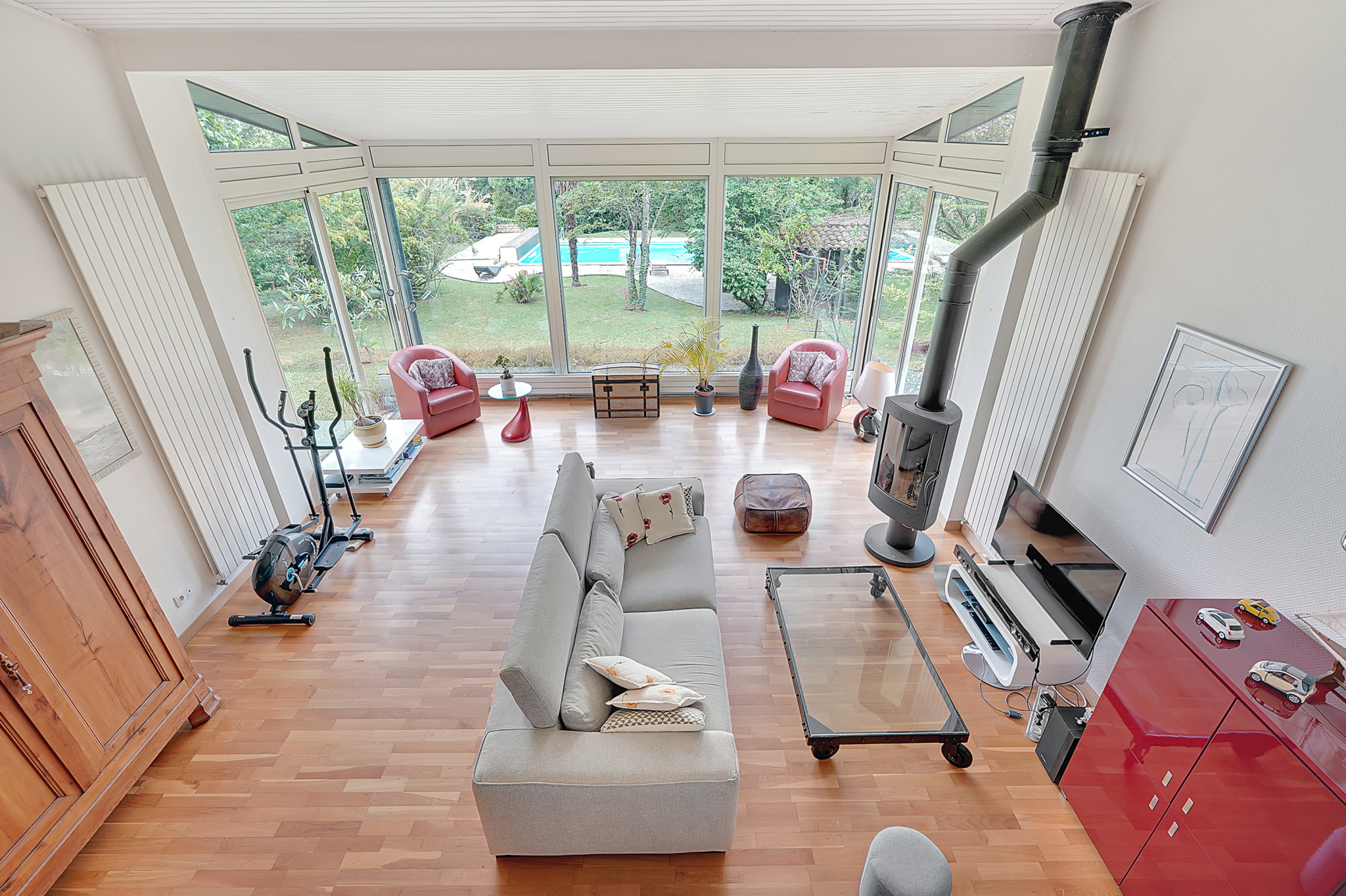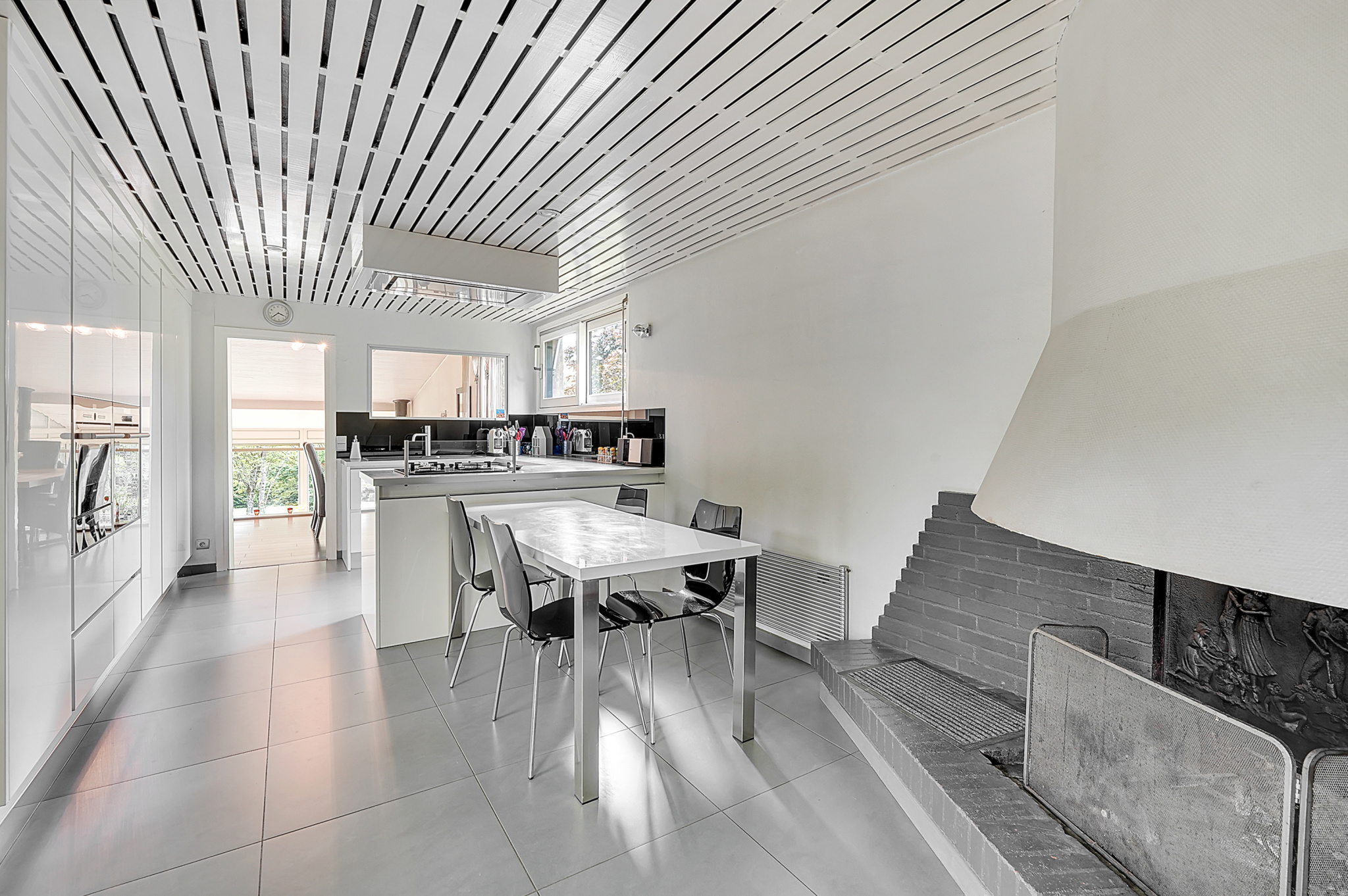 Villa d’architecte très lumineuse de 150 m2 nichée dans un écrin de verdure composée d’un hall d’entrée avec murs en pierre, un espace de vie déplafonné lumineux avec poêle à bois, une salle à manger, une cuisine équipée et aménagée avec cheminée à foyer ouvert, 4 chambres dont une chambre parentale avec salle d’eau, une salle de bain avec double vasques.