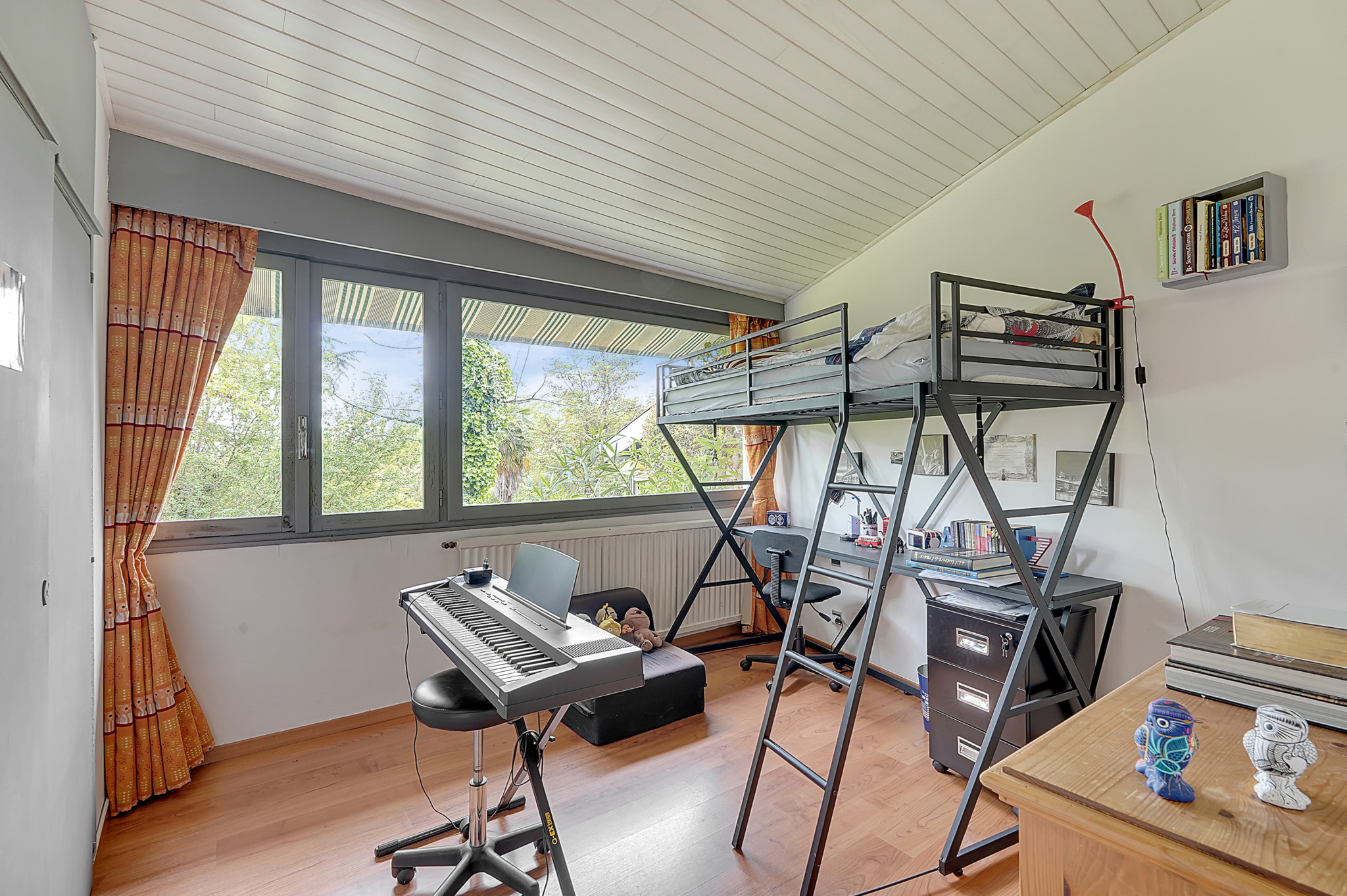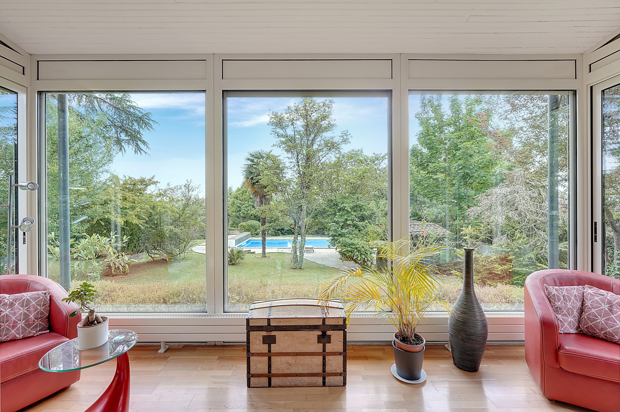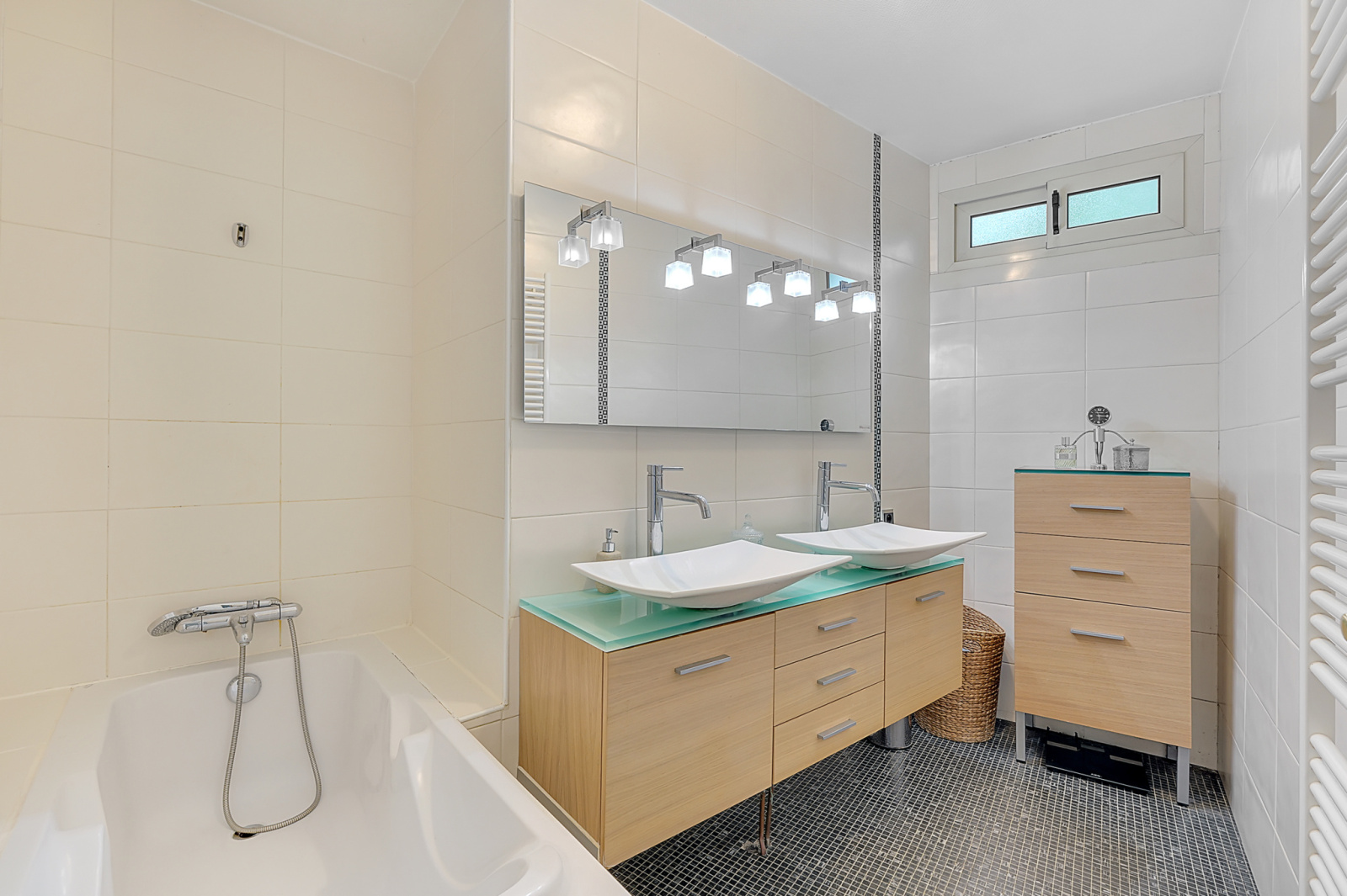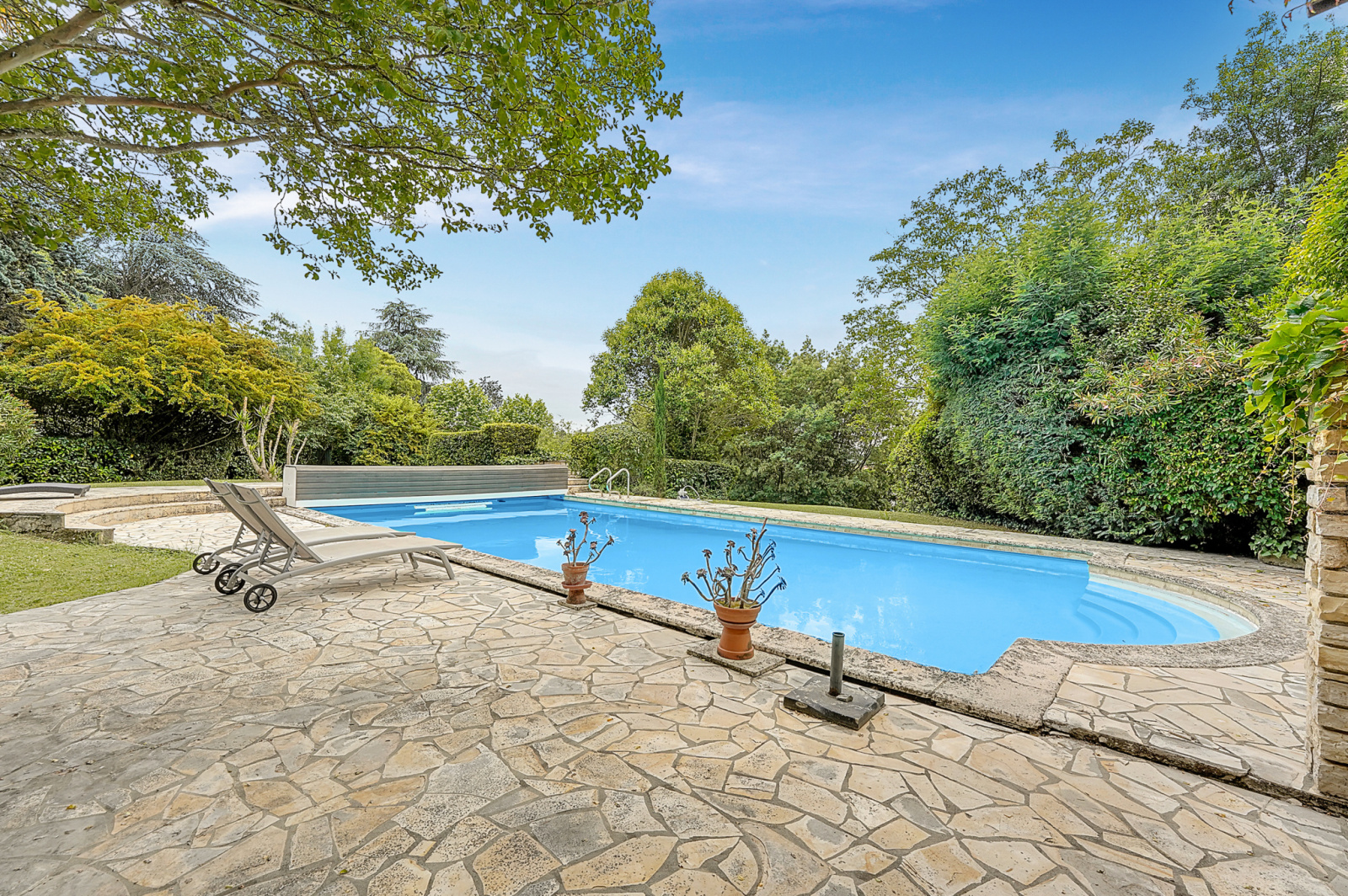 Villa d’architecte très lumineuse de 150 m2 nichée dans un écrin de verdure composée d’un hall d’entrée avec murs en pierre, un espace de vie déplafonné lumineux avec poêle à bois, une salle à manger, une cuisine équipée et aménagée avec cheminée à foyer ouvert, 4 chambres dont une chambre parentale avec salle d’eau, une salle de bain avec double vasques.