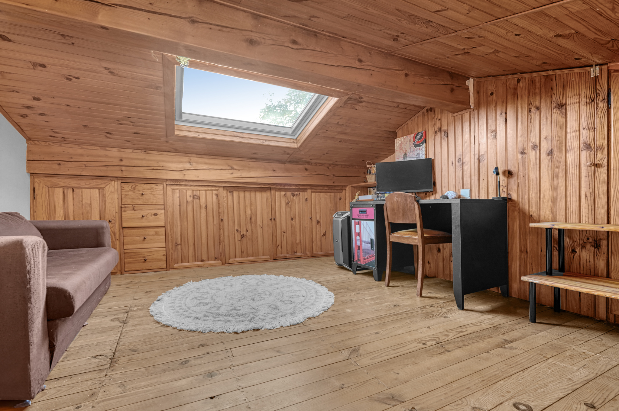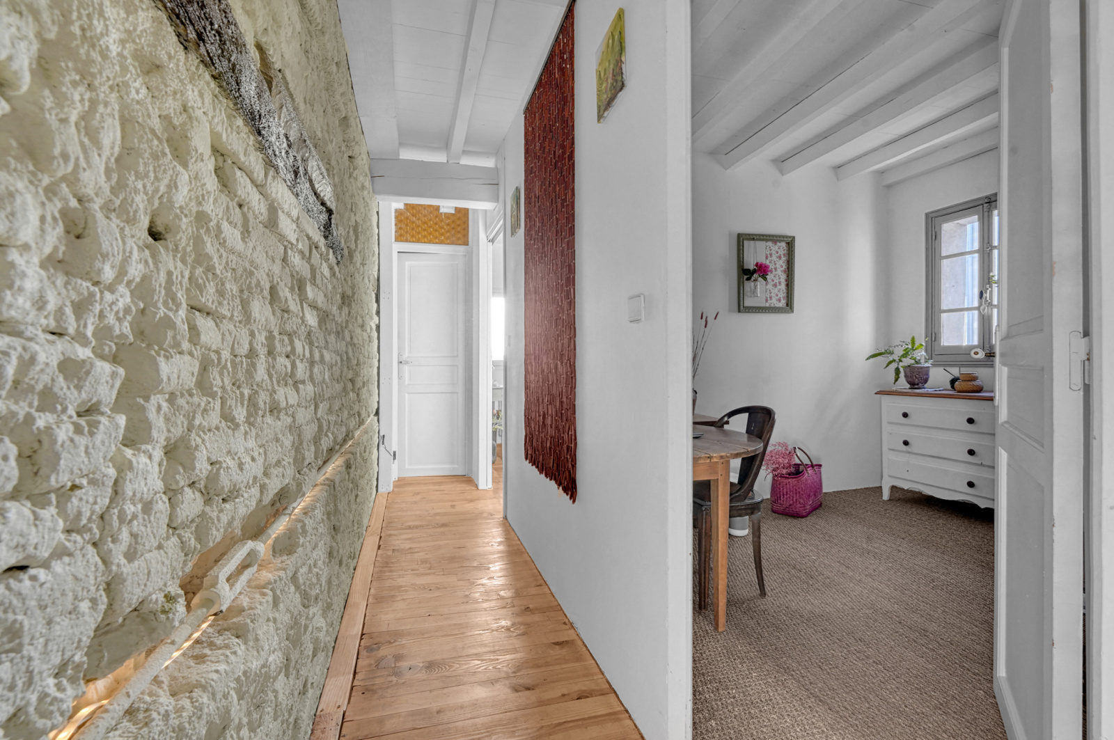 L'étage se compose d'un couloir en briques foraines, desservant 3 chambres dont une avec un point de vue magnifique sur la campagne, une salle d'eau, un WC et un grenier aménagé lumineux qui pourrait se destiner en salle de jeux, bureau, chambre d'ami ou encore observatoire du ciel étoilé.