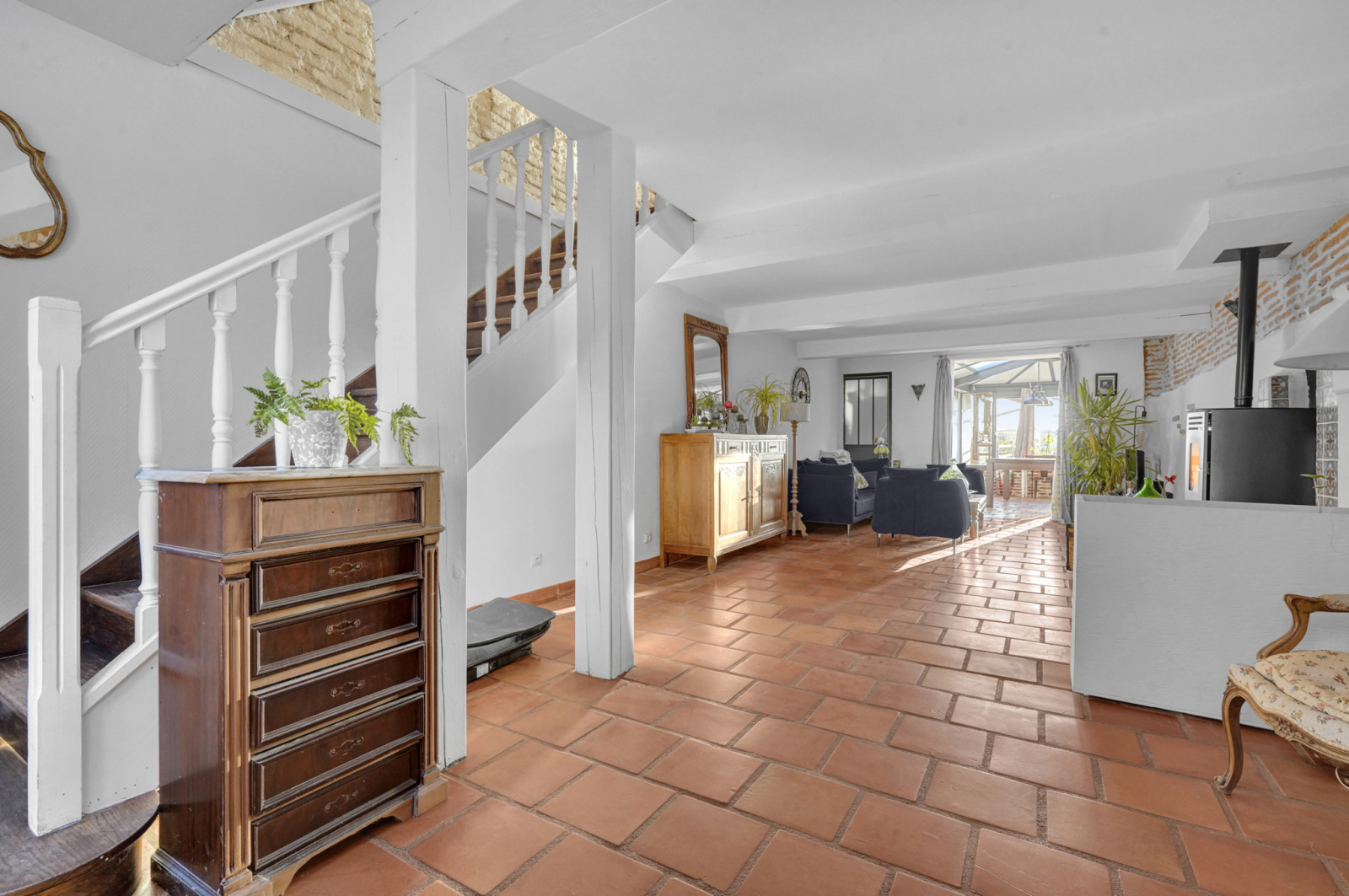 Le charme de l'ancien est au rendez-vous pour cette maison d'environ 127 m2 comprenant au rez-de-chaussée un grand salon d'une superficie de 43 m2 avec poêle à granulés, tomettes et poutres apparentes, une cuisine équipée, aménagée et son coin repas très spacieux avec verrière de toit laissant pénétrer les espaces de lumières, un cellier, un WC.