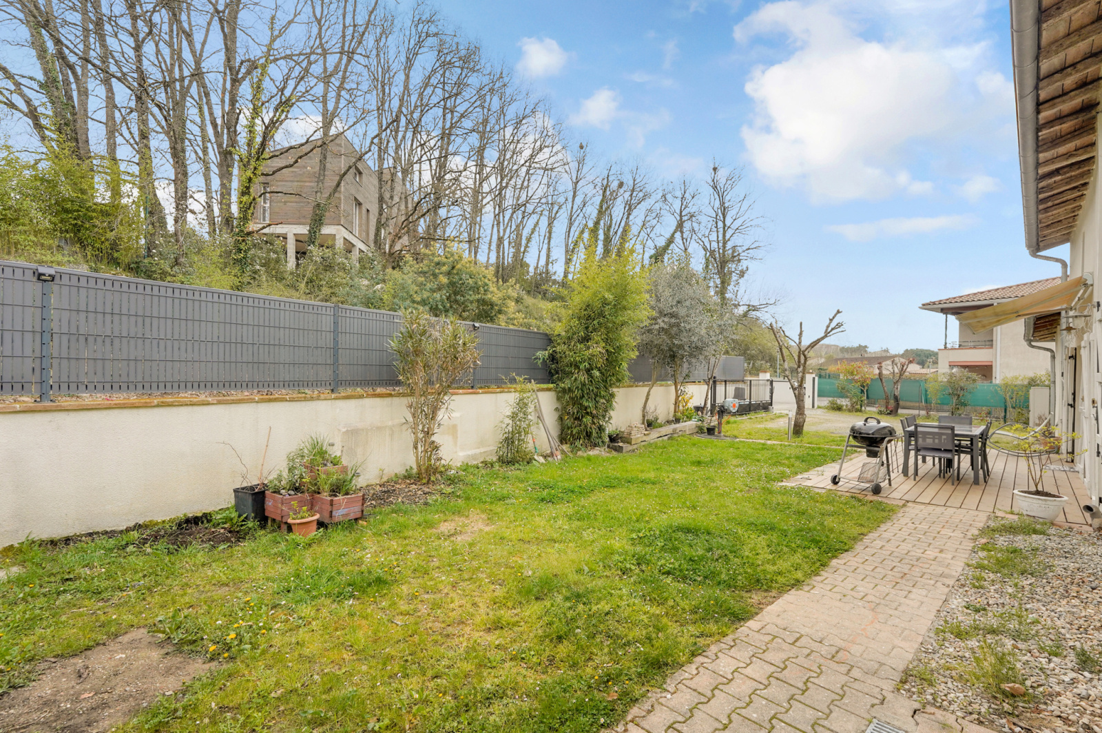 Côté extérieur, vous profiterez d'un terrain clos de 729 m ², agrémenté d'une grande terrasse en bois, parfaite pour des moments de détente.