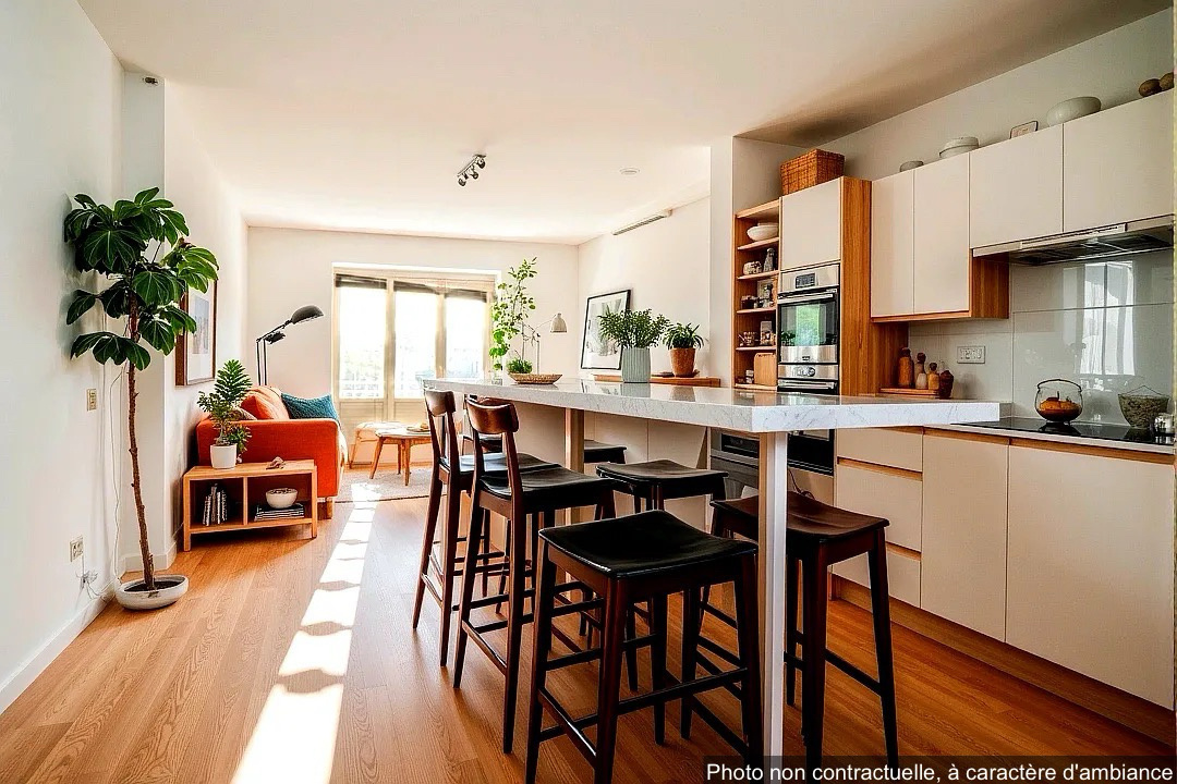 La pièce de vie spacieuse et traversante vous accueille dans une ambiance chaleureuse et moderne. La cuisine ouverte, entièrement aménagée et équipée, s’intègre harmonieusement à l’espace, invitant aux moments conviviaux en famille ou entre amis.